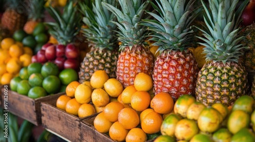 A tropical fruit market with a variety of pineapples and exotic fruits, showcasing the vibrant colors of the produce.