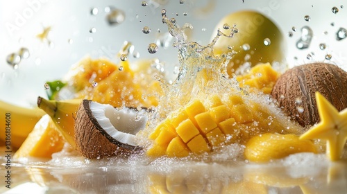 A tropical fruit splash with a mix of mangoes, papayas, coconut, bananas, and starfruit, splashing in yellow, brown, and green, set against a white background