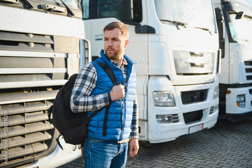 A truck driver with a backpack in a truck parking lot before the start of the work week.