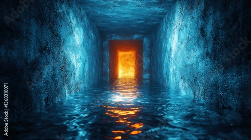 A tunnel corridor, with water, and a glowing orange door