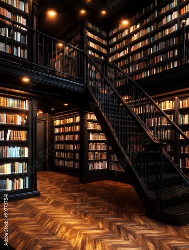 A two-story library with a grand staircase, filled with bookshelves and warm lighting, inviting readers to explore and discover hidden knowledge.