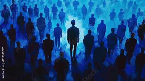 A unique figure stands out among a sea of blue silhouettes, symbolizing individuality and contrast in a crowd.