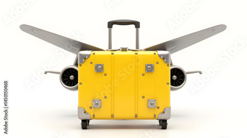 A unique yellow suitcase designed to resemble an airplane, featuring jet engines and wings, perfect for travel enthusiasts.