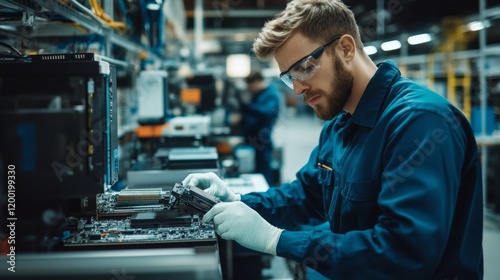 A US technician replacing computer hardware in a factory setting, isolated on white,