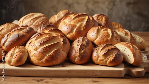 A variety of artisanal breads arranged on a wooden cutting board, bread selection, whole grain bread