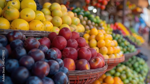 A variety of colorful fruits arranged in market baskets, showcasing a vibrant and fresh display of produce.