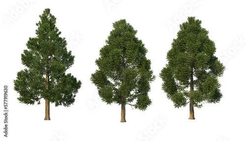 A variety of coniferous trees on a transparent background.