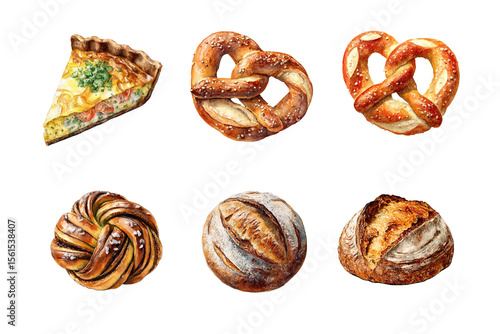 A variety of delicious baked goods including pretzels and pastries. Isolated on white background, Transparent background