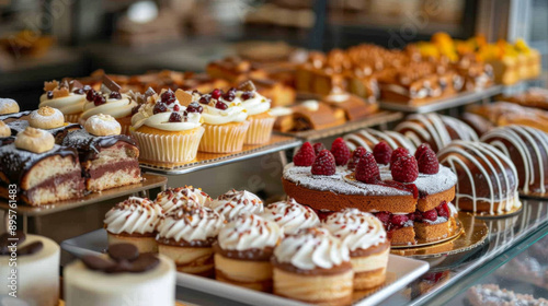 A variety of delicious desserts and pastries, including cupcakes and cakes, beautifully arranged on a bakery display counter.