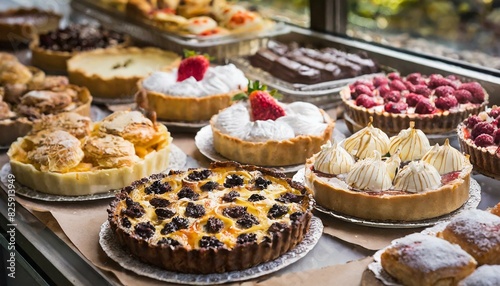 A variety of different pies in a display window for sale; delicious, gourmet pastries