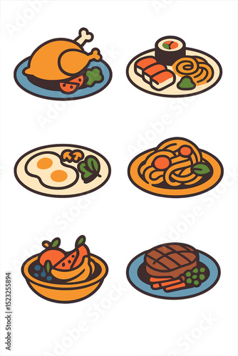 A variety of dishes are served on plates and in bowls, including lunch and dinner meals consisting of meat, vegetables, mushrooms, chicken, sushi, pasta, fried eggs, and fruits, depicted as flat