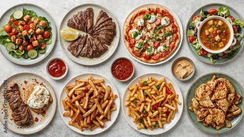 A variety of dishes including salad, grilled meat, pizza, soup, fries, and chicken served on plates with sauces and condiments.