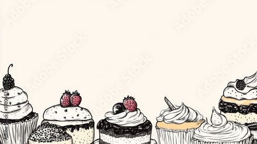 A variety of hand-drawn cupcakes with frosting and berries, set against a minimalist background. Perfect for bakery or dessert-themed designs.