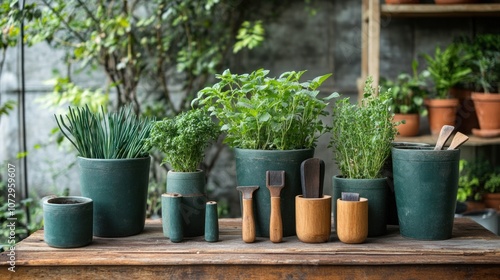 A variety of herbs potted in green ceramic pots with gardening tools on a rustic wooden table.