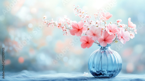 A vase filled with pink flowers sits on a table. The flowers are arranged in a way that they are not too crowded, and the vase is not overflowing with flowers.