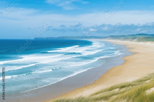 A vast expanse of golden sand meets the turquoise ocean under a bright blue sky with puffy white clouds