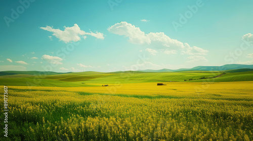 A vast, fresh prairie with crops under a clear blue sky and white clouds, showcasing an expansive and serene rural landscape