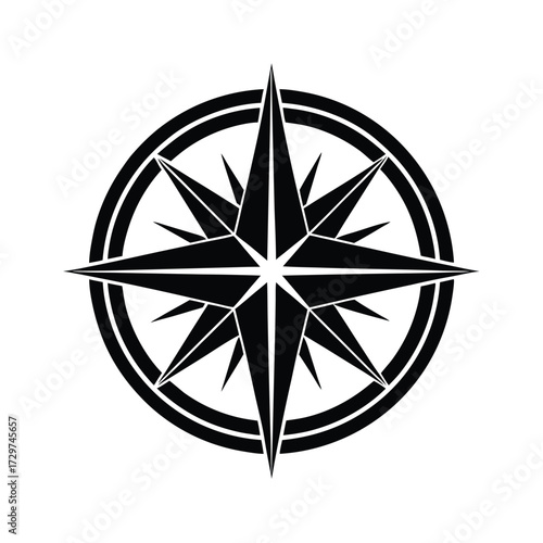 A vector illustration of an old compass rose icon on a black background symbolizing north, travel, and adventure navigation