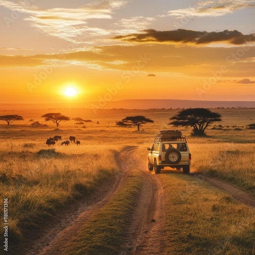 A vehicle drives down a dirt road in a field, surrounded by nature