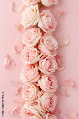 A vertical delicate bouquet of pink roses runs along a soft pink backdrop, creating a romantic valentine mood perfect for greeting cards, romance themes and love celebration visuals