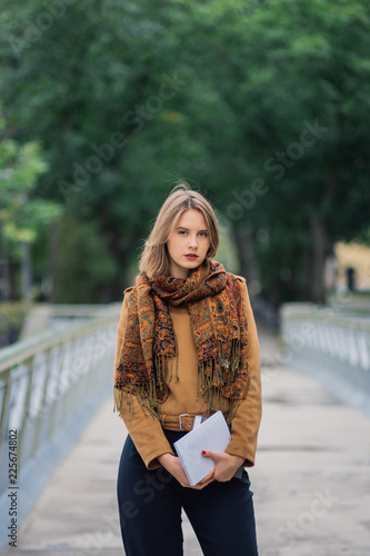 A very beautiful girl is standing on an iron bridge and is posing on the camera.