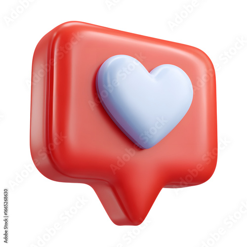 A vibrant 3d rendered red social media notification bubble with a prominent light blue heart icon symbolizing likes and positive engagement against a stark black background