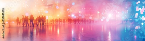 A vibrant, abstract scene depicting silhouettes of people against a colorful, blurred background of lights and reflections.