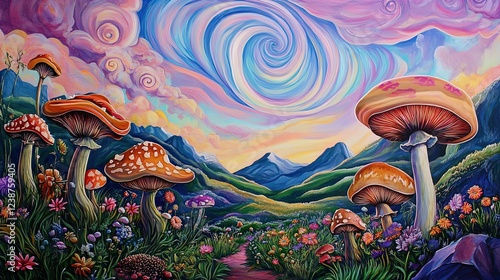 A vibrant and surreal landscape featuring oversized mushrooms in various colors, set against a mesmerizing sky filled with swirling clouds and vivid hues. The foreground is rich with a variety of colo