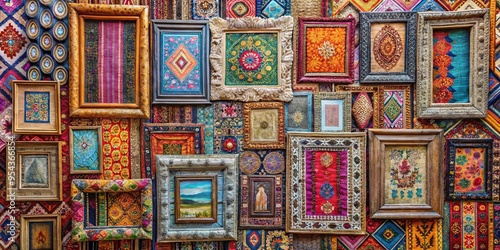 A vibrant and unique eclectic tapestry with colorful vintage frames, boho textures woven together to create a stunning visual