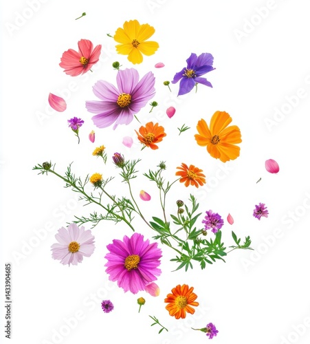 A vibrant array of colorful flowers with delicate petals scattered around them