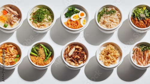 A vibrant array of gourmet dishes served in white bowls, showcasing diverse flavors and textures