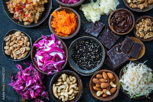 A vibrant assortment of healthy ingredients including nuts, seeds, shredded vegetables, and dark chocolate.