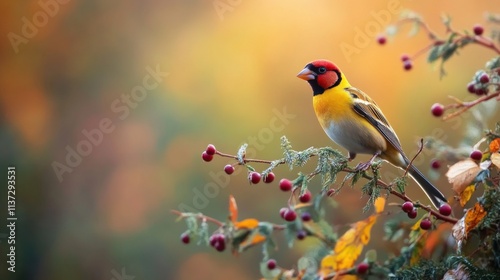 A vibrant bird perched on a branch with berries, set against a colorful autumn background.