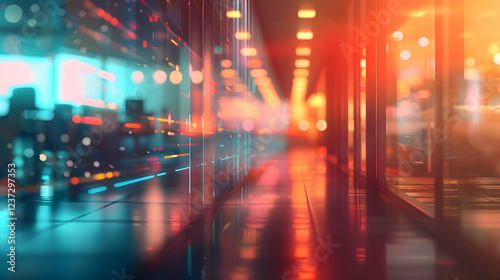A vibrant, blurred corridor with colorful lights, suggesting a modern, tech-inspired environment.