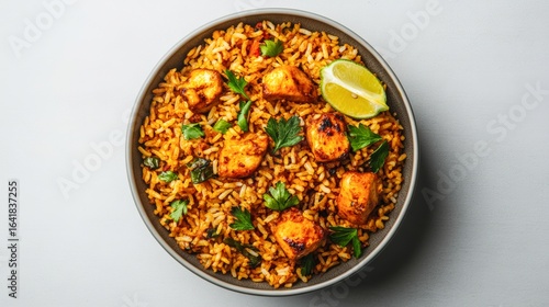 A vibrant bowl of spiced rice with grilled chicken pieces, garnished with fresh parsley and a slice of lime, ideal for culinary blogs, recipe books, or food-related promotions,