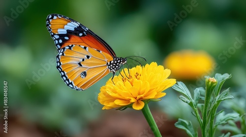 A vibrant butterfly perched on a bright yellow flower, showcasing the beauty of nature and the delicate balance between insects and plants.