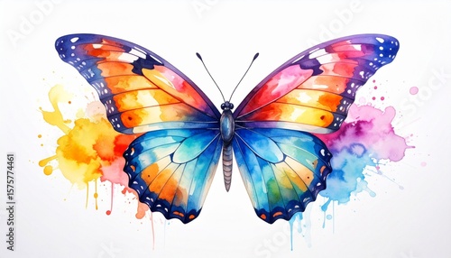 A vibrant butterfly with gradient wings in watercolor hues of blue, orange, yellow, and pink, surrounded by splash effects—symbolizing transformation, beauty, and creativity.