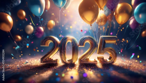 A vibrant celebration scene featuring the year "2025" with colorful balloons and confetti, symbolizing New Year's festivities.