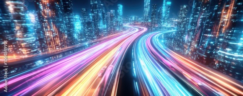 A vibrant cityscape at night, showcasing colorful light trails on a busy highway, symbolizing speed and modernity.