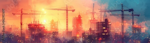 A vibrant cityscape featuring multiple construction cranes against a colorful sunset sky, symbolizing urban development and growth.