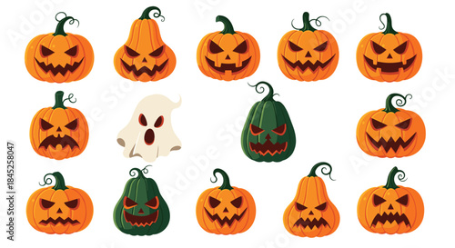 A vibrant collection of spooky jack-o'-lanterns and a friendly ghost isolated on a clean white background for Halloween designs.