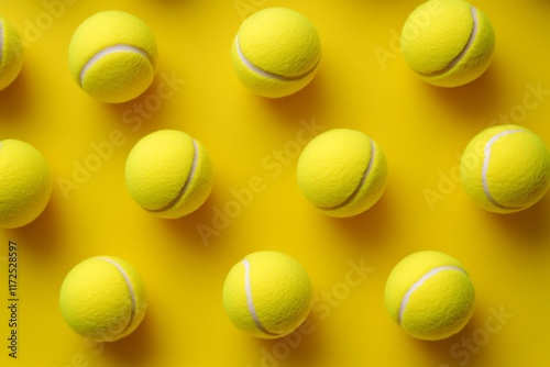A vibrant collection of tennis balls scattered against a bright yellow background, creating a lively
