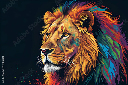 A vibrant, colorful depiction of a lion's head, showcasing a majestic mane filled with hues of blue, green, red, and yellow against a black background.