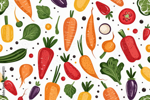 A vibrant, colorful pattern of various vegetables including carrots, tomatoes, and peppers on a light background, ideal for healthy lifestyle concepts.