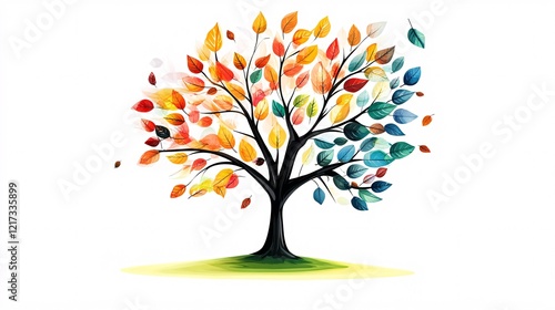 A vibrant, colorful tree with autumn leaves showcasing shades of red, yellow, orange, and green.