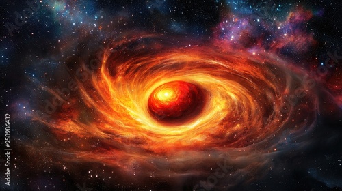 A vibrant cosmic swirl depicting a black hole surrounded by colorful galactic elements.