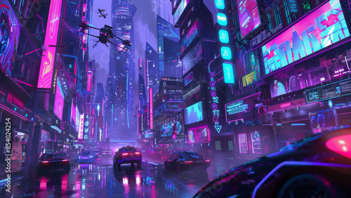A vibrant cyberpunk cityscape illuminated by neon lights, featuring futuristic skyscrapers and drones patrolling the urban night scene.
