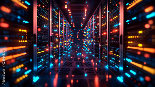 A vibrant data center corridor illuminated by colorful lights, showcasing rows of servers with glowing cables. atmosphere is dynamic and futuristic, emphasizing technology and innovation