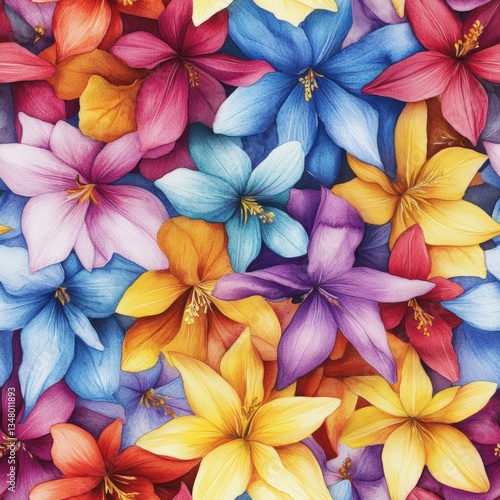 A Vibrant Dense Cluster of Stylized Flowers in Jewel Tones of Blues, Purples, Pinks, Oranges, and Yellows Rendered in Watercolor Style