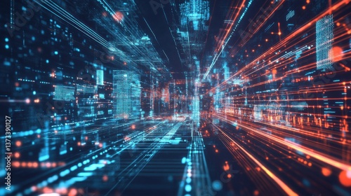 A vibrant digital scene depicting fast-moving data streams, showcasing a futuristic cityscape filled with glowing lines and patterns.